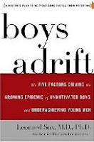 Boys Adrift by Leonard Sax. If you have a son, you should read this book. It was recommended to me some time ago by a friend who said it presented some very compelling insights, but when I first picked it up, I was reluctant because of the word "epidemic" - I'm not a big fan of doomsdayers and naysayers and often find that these kind of perspectives are reinforced by schewed statistics to support a very anecdotal opinion.
