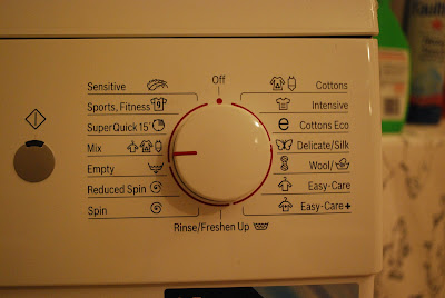 Here's the washer. All the cycles are over 90 minutes except for the "Quick" and the "Mix." And since I can set the temperature manually with some other buttons, I go for "Mix." But I have come to appreciate the cute drawrings of different types of clothing. And I have found the "empty" button helpful, since the washer is right at Charlie's level and he has helpfully restarted a cycle just as I was going to move already washed clothing to the dryer.