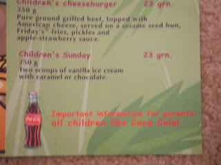 But our waitress was nice, and English speaking, and the fajitas were passable. Only in Ukraine, though, would you order a kids quesadilla and the cook would feel the compulsion to include tomatoes and ham and mayo in the quesadilla. But the boys gobbled it up. The main drawback? It's expensive. But there were some entertaining highlights, such as this little addendum to the kids' menu: