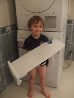 You'll never hear me complain about having a washer and dryer, but one liquid bane of my existence was (is) the water catcher on the clothes dryer. It took a few loads of laundry and the dryer refusing to function before I realized that this long tank has to be emptied regularly (between each load, sometimes twice per load if it's jeans or towels). It holds more than a gallon of water and because it pulls straight out of the very top of the dryer, when it is full of water it is awkward and inevitably splooshes on the floor or down the front of me. But it is mildly interesting to see how much water is still in the clothes even after they've spun in the washer.Charlie continues to be enamored with the spigots on the front of the water filter. It brings back memories of the Brita pitcher we once owned. But unlike the Brita thing, there is no child-proofing our water system. Except that the boiling hot spigot has been disconnected to avoid the scalding of small children. (Ironically, a good scald would probably keep a child from ever touching it again, I'd think. But while probably the most effective kind of childproofing, probably not the preferred method, right?)