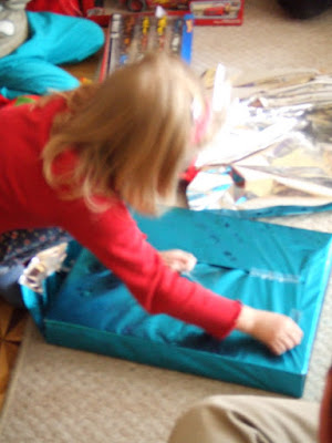 This little girl opened her gift so carefully. She pulled off each piece of tape individually from the seam and kept them, then folded the wrapping into a nice little square. Later, when she had her stocking, she pulled one thing out of it at a time, admiring each piece of candy and each little toy, asking questions and playing with one things for a few minutes before she took the next thing out. -