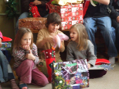 This is probably my favorite picture of the day, although a lot of the pictures captured the same idea. I was amazed and touched by how excited each of the children was, not only for their own gift, but for what others received. They cheered and were in awe when someone opened something. They waited expectantly to see what was in each present. And of course, I don't know how the ensuing hours or days were, but just the initial reaction of excitement for others' joy and great gifts was so tender and sincere. Even children who hadn't been called for a gift yet were interested in the joy of their little friends and rejoiced with them. I didn't see any jealousy or sulking or grouchy impatience or resentment over "different" or "better" gifts. I didn't see anyone hoarding or refusing to share, either. They were happy to have and happy to share. They were all just happy because everyone around them was happy.