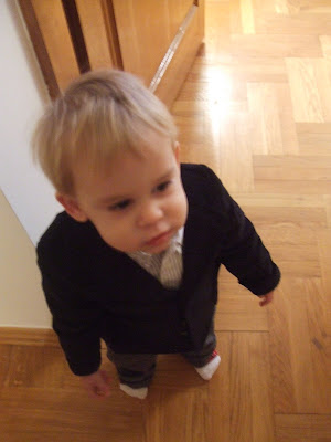 Wow, he's so cute! I can tell the little tyke is enjoying himself even though he's throwing a fit! I don't think I'll get annoyed at a kid throwing a fit if he/she's as cute as your kid! Oh, and you should try silk ties to go with that suit - i think it would look magnificent for the little fellow.